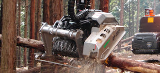 プロセッサ・ハーベスタで用途にあった長さに木を玉切します。